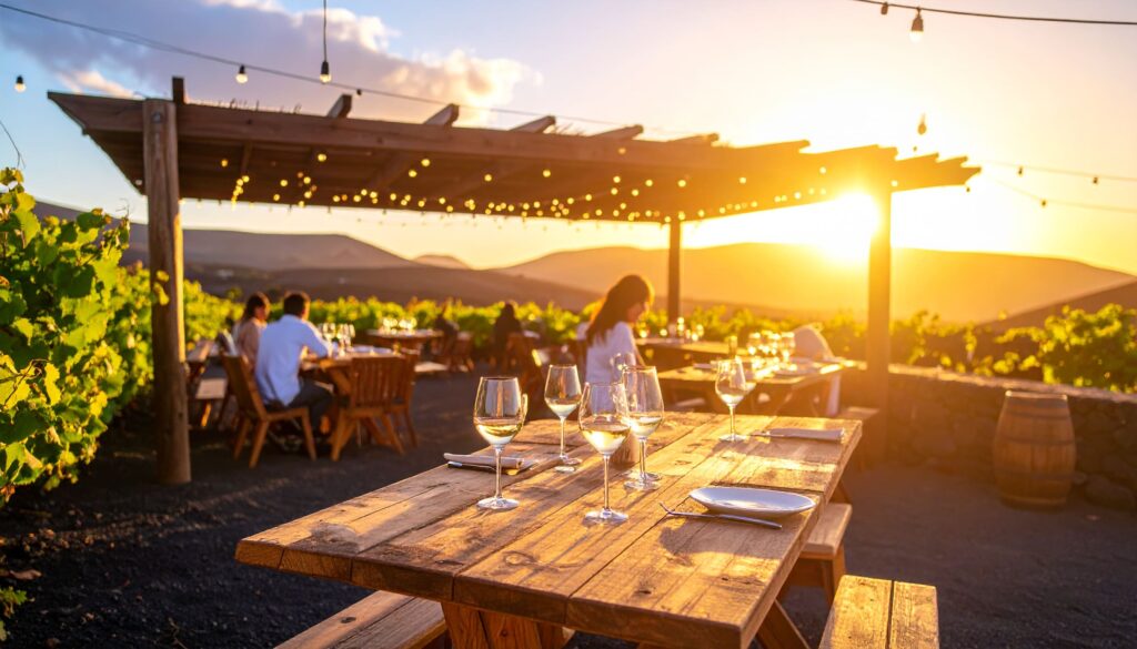 Restaurant-Tipp: El Chupadero (La Geria) Mitten im Weinbaugebiet liegt das charmante Restaurant El Chupadero. Unter einer Pergola mit Blick auf die Weinreben genießt man Tapas, perfektes kanarisches Lamm und kreative vegetarische Gerichte. Am Abend sorgen Lampions und Kerzen für eine magische Atmosphäre. Perfekt, um lokale Weine zu probieren und den Sternenhimmel zu bestaunen.